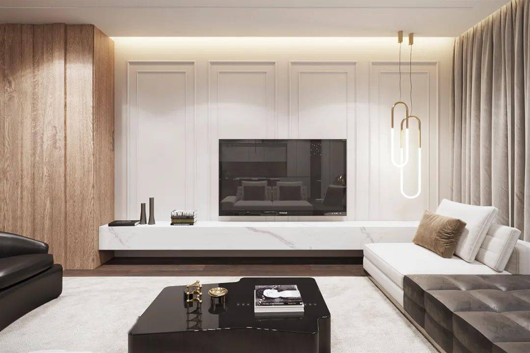 1、某现代简约风格的客厅设计中,采用了白色大理石背景墙,搭配简约的线条和灯光设计,营造出舒适而时尚的观影环境。